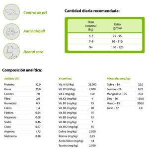 Ingredientes: pollo, maíz, gluten de maíz, grasa de pollo, arroz, huevo entero deshidratado, pulpa de achicoria, proteína de leche, lino, aceite vegetal, levadura de cerveza, proteína hidrolizada de pollo, taurina, arginina, metionina, vitaminas y minerales Sus beneficios: Croqueta grande, adaptada para favorecer la correcta masticación, evita la formación de sarro y ayuda a la digestión gracias a las enzimas salivares. Previene la urolitiasis gracias al bajo nivel de magnesio y la acidificación de la orina con metionina. Favorece la eliminación de las bolas de pelo y previene las posibles obstrucciones intestinales y mejora la digestión gracias a la adición de fructoligosacáridos (F.O.S.). Con protectores de cartílago para el cuidado de las articulaciones de estos grandes gatos. Incorpora omega3 y omega6 y biotina para conseguir un pelo brillante y sedoso.