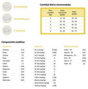 - Previene la urolitiasis gracias a la restricción de magnesio y la acidificación de la orina con metionina.