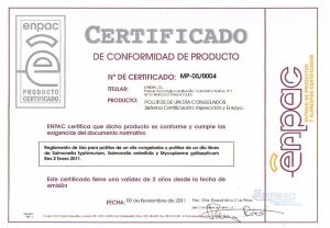 * Certificado de producto ENPAC pollitos de un día congelados. [ Elaborados bajo la norma de calidad ISO 9001 ]